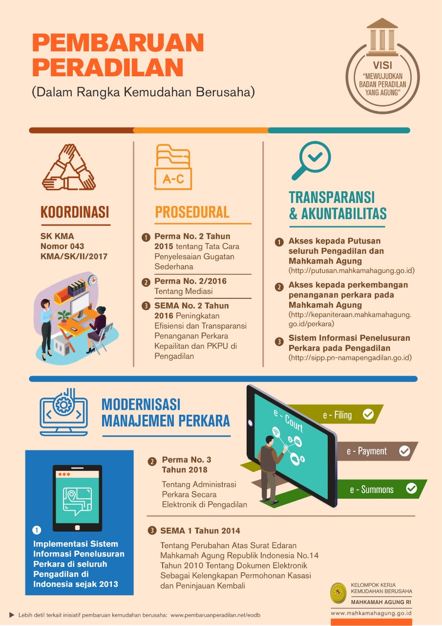 Berdasarkan Peraturan Mahkamah Agung Republik Indonesia Nomor 3 Tahun 2018 Tentang Adminitrasi Perkara di Pengadilan Secara Elektronik maka Mahkamah Agung meluncurkan Aplikasi e-court. e-court adalah layanan bagi Pengguna Terdaftar untuk Pendaftaran Perkara Secara Online, Mendapatkan Taksiran Panjar Biaya Perkara secara online, Pembayaran secara online dan Pemanggilan yang dilakukan dengan saluran elektronik. Adapun fitur aplikasi ecourt antara lain :