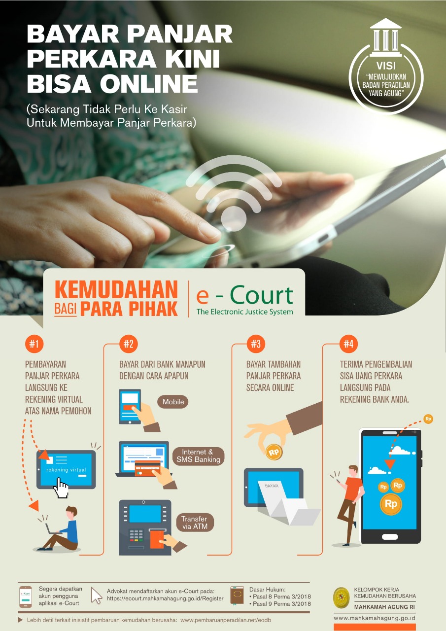 Untuk kelancaran dalam mendukung program e-Court Mahkamah Agung RI bekerja sama dengan Bank Pemerintah dalam hal manajemen Pembayaran Biaya Panjar Perkara . Dalam Hal ini Bank yang telah ditunjuk menyediakan Virtual Account (Nomor Pembayaran) sebagai sarana pembayaran kepada Pengadilan tempat mendaftar perkara