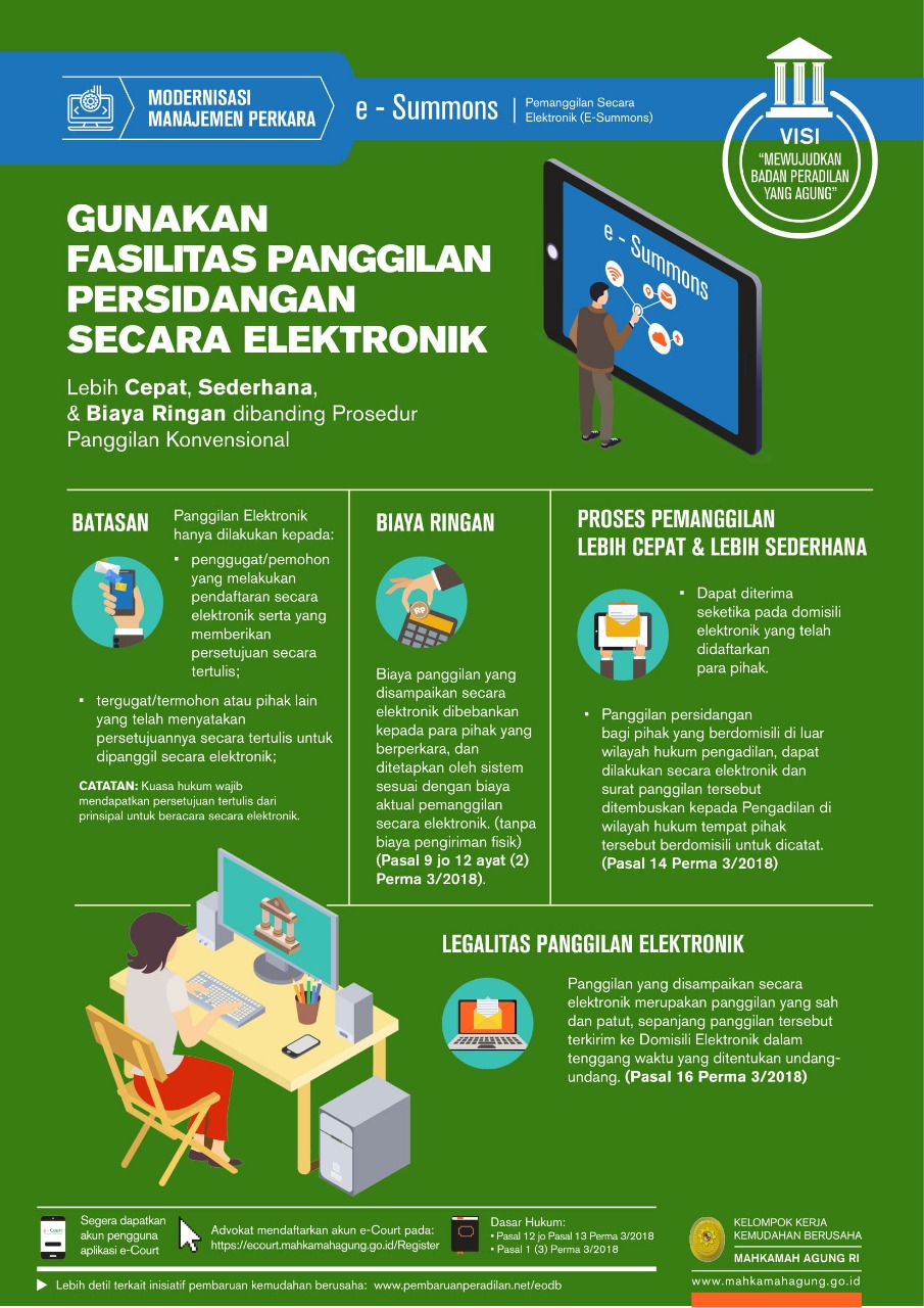 Berdasarkan Peraturan Mahkamah Agung Republik Indonesia Nomor 3 Tahun 2018 Tentang Adminitrasi Perkara di Pengadilan Secara Elektronik maka Mahkamah Agung meluncurkan Aplikasi e-court. e-court adalah layanan bagi Pengguna Terdaftar untuk Pendaftaran Perkara Secara Online, Mendapatkan Taksiran Panjar Biaya Perkara secara online, Pembayaran secara online dan Pemanggilan yang dilakukan dengan saluran elektronik. Adapun fitur aplikasi ecourt antara lain :