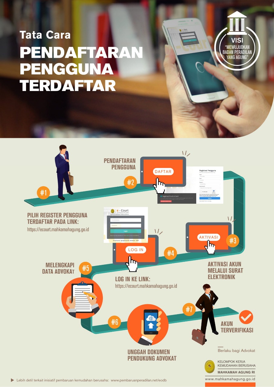 Dalam hal pendaftaran perkara Online, saat ini dikhususkan untuk Advokat. Pengguna terdaftar harus setelah mendaftar dan mendapatkan Akun, harus melalui mekanisme validasi Advokat oleh Pengadilan Tinggi tempat dimana Advokat disumpah, sedangkan pendaftaran dari Perseorangan atau Badan Hukum akan diatur lebih lanjut. Layanan dan Penjelasan singkat Pendaftaran Perkara Online.